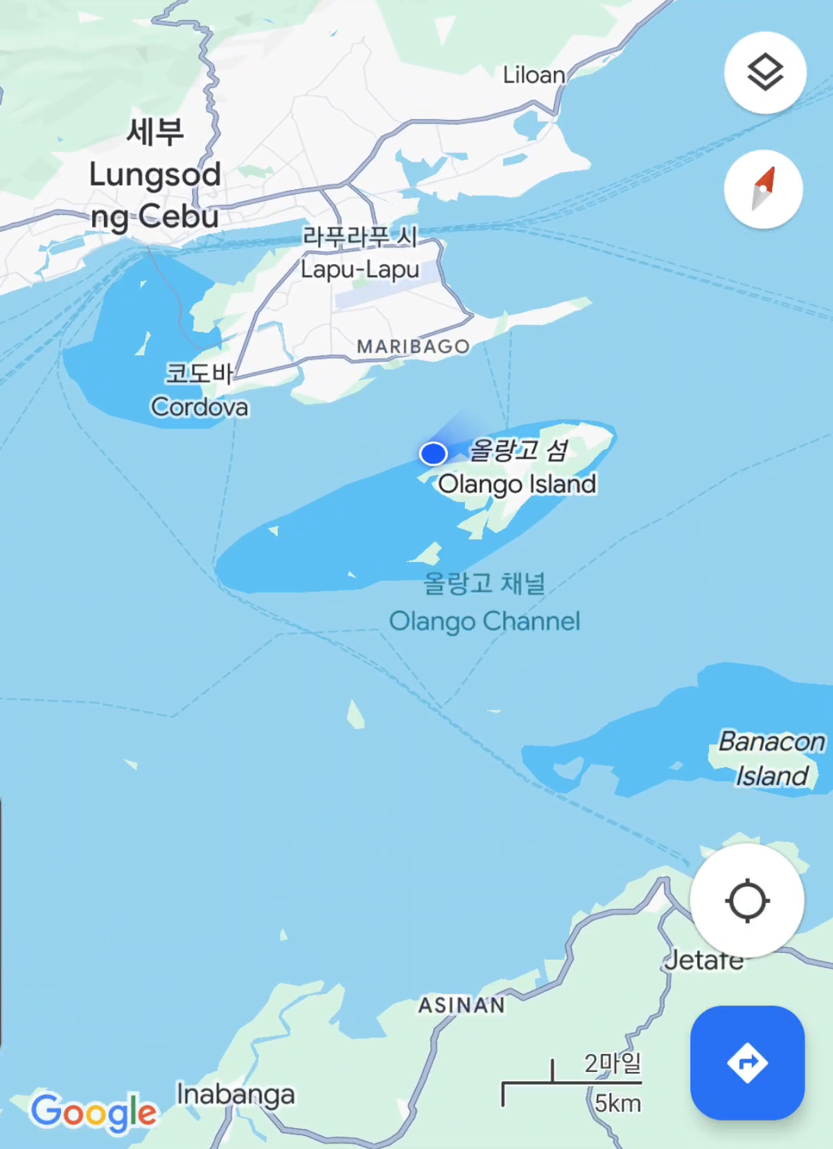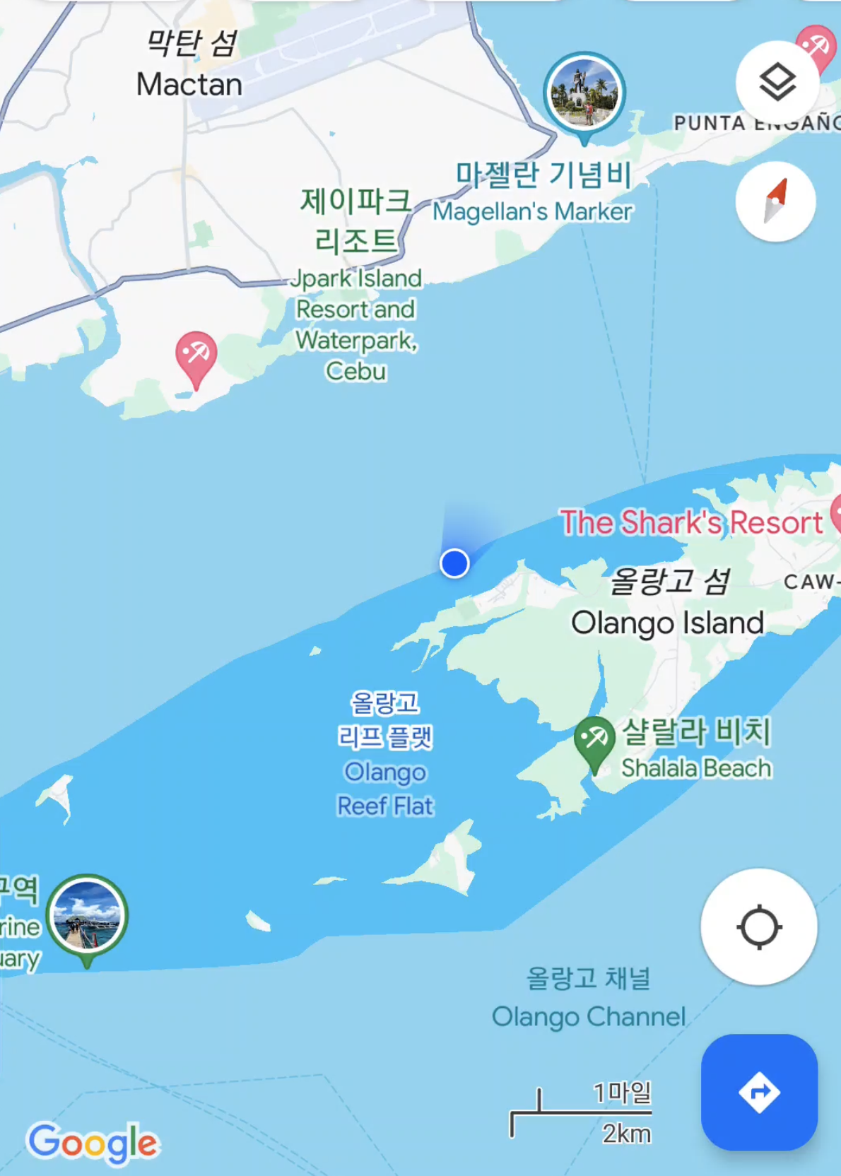 - 좀더 확대해보았습니다. 올랑고 섬과 막탐섬이 마주 하고 있군요.