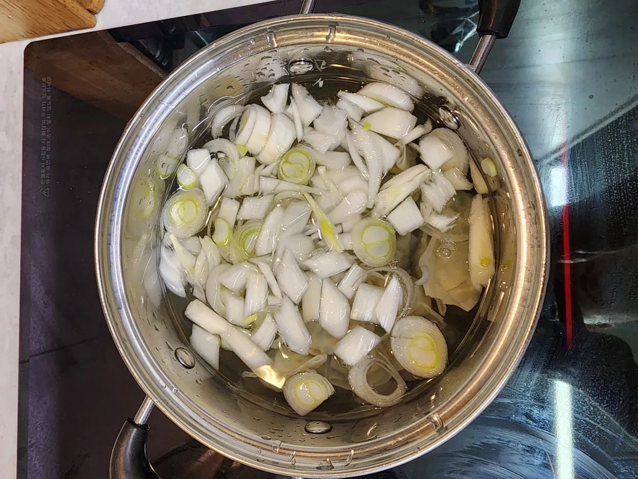 양파, 파도 넣습니다. 육수한알도 하나 넣습니다. 빨리 끓이는게 목표라 한꺼번에 넣고 끓이고 간으로 승부를 보고자 합니다.