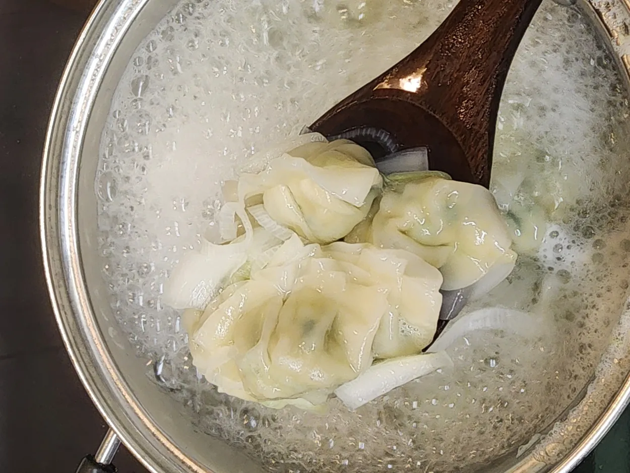 끓어 오르면 거품 및 분순물을 제거 합니다. 까나리 액젓 반 스푼을 넣습니다. 소고기 다시다도 1/4 스푼 정도 넣었습니다. 만두를 3개 정도 중간을 잘라서 깨어 줍니다. 만두속도 끓여서 국물을 내면 더 만두향이 국에서 나더라구요. 이제 계속 해서 끓입니다.  총 시간은 10분
