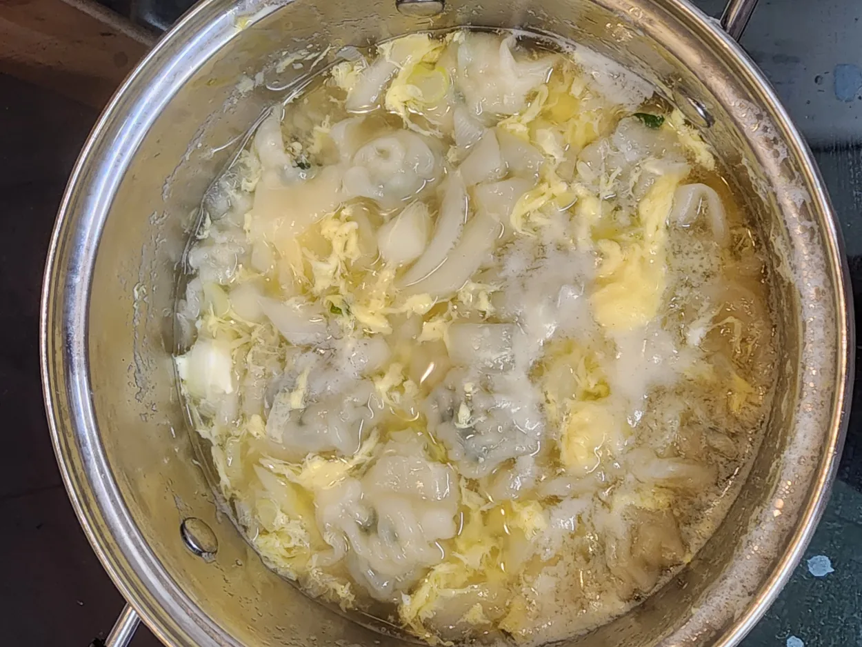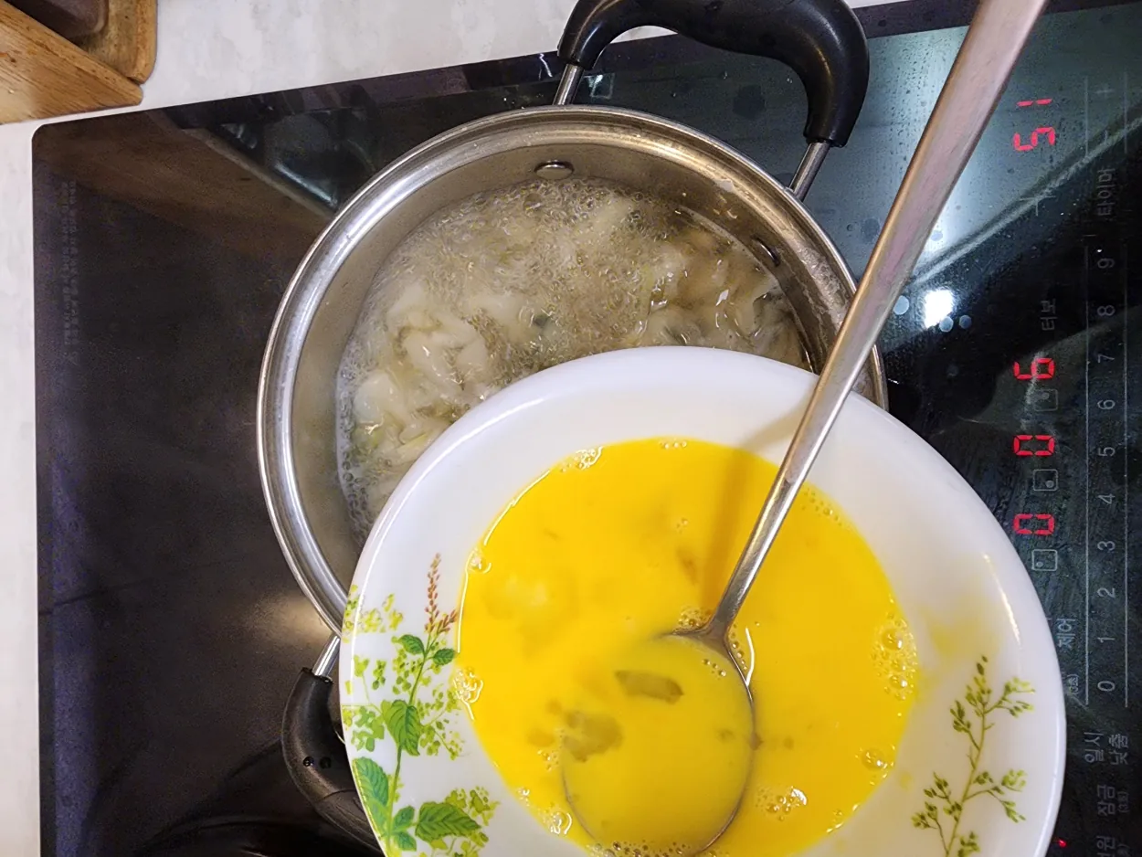간장을 한스푼 넣습니다. 소금으로 간을 봅니다. 계란 풀어서 넣습니다. 5분 끓입니다.