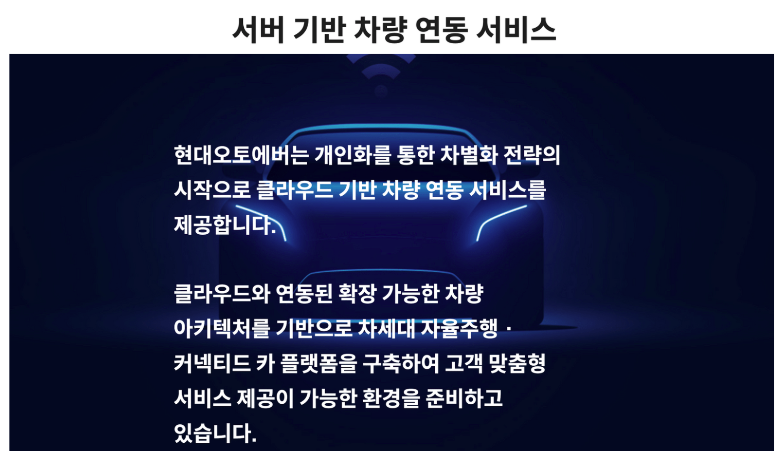 현대오토에버의 소개 페이지를 가지고 PT 형태로 만들어 본것입니다.  출처는 아래와 같습니다.  현대오토에버 커넥티드카서비스 안내 페이지 현대 자동차에 대한 커넥티트카 서비스를 개발하고 있는 현대오토에버의 기술 소개 사이트의 내용입니다.