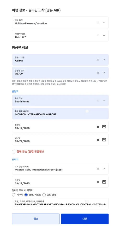 도착 공항, 항공편 번호, 체류 주소(호텔 예약 정보)를 입력해야 합니다. 아래 필리핀 etravel 화면 참조 | 필리핀 이트래블 작성방법