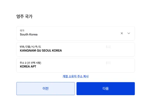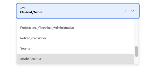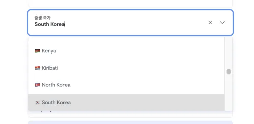 출생 국가는 korea라고 쳐서 넣으면 아래와 같이 유사한 국가들을 선택하도록 리스트가 나옵니다.