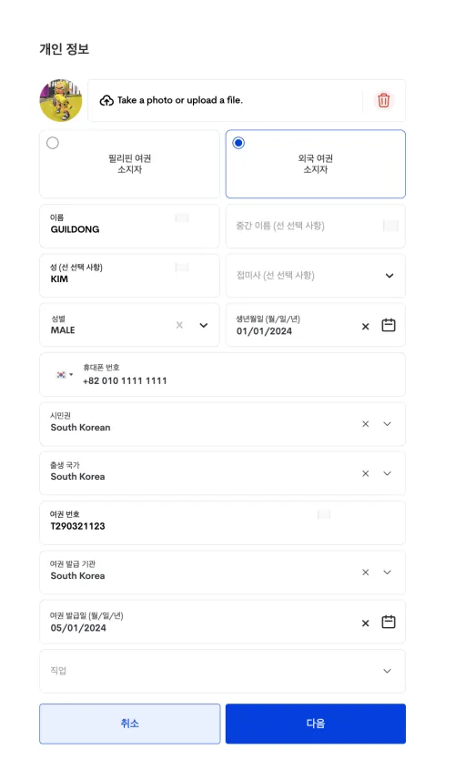 필리핀 이트래블 작성방법에서 제일 중요한 개인 정보관련 사항인 여권 정보, 생년월일, 국적, 성별 등 필수 정보를 입력합니다.