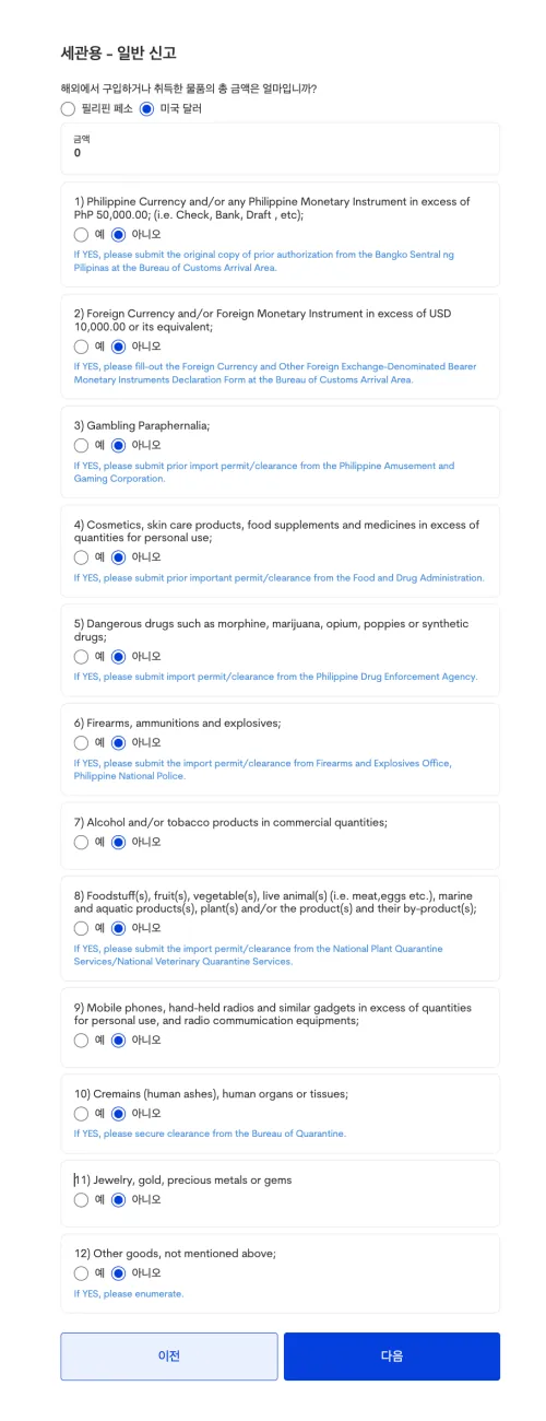 세관 신고 할께 있다고 예를 선택 했기때문에 아래와 같이 일반 신고 사항 화면이 나옵니다. 전부 " 아니요 "