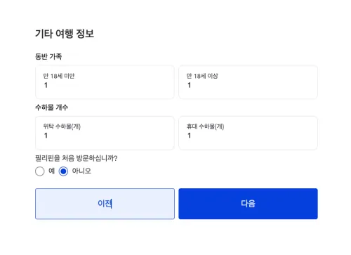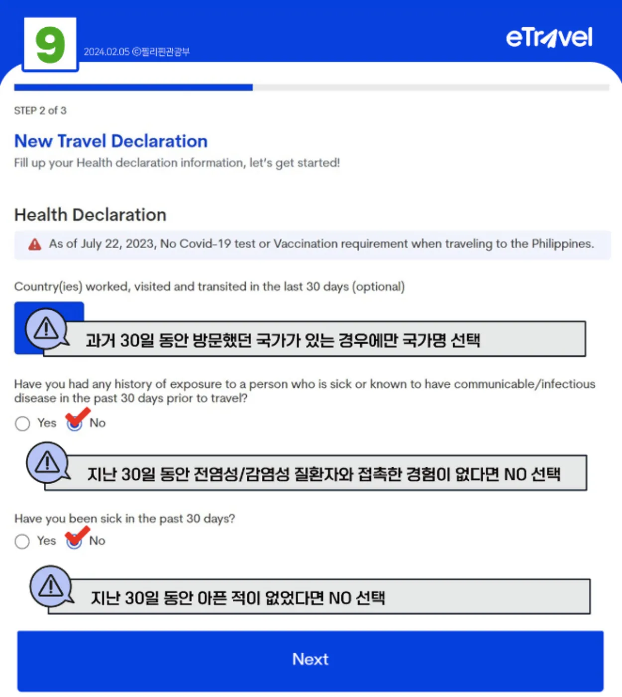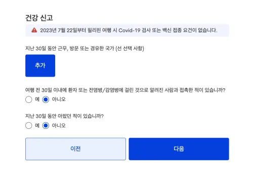 최근 방문 국가, 건강 상태, 백신 접종 여부 등을 입력합니다. 아래 필리핀 etravel 화면 참조 | 필리핀 이트래블 작성방법