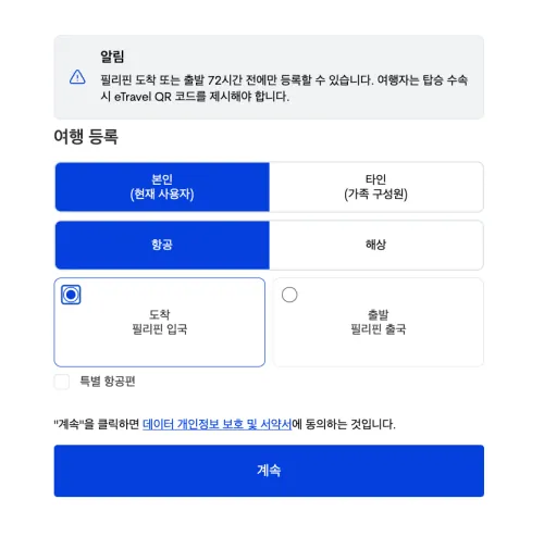 본인 여행 신청이므로 본인 , 항공 , 도착 ( 필리핀 입국 ) 을 선택 하고 계속 버튼을 누릅니다.