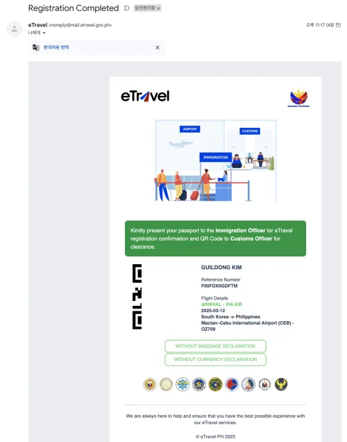 모든 정보를 입력한 후 확인하면 QR 코드가 발급됩니다. 이 코드를 공항에서 제시해야 합니다.