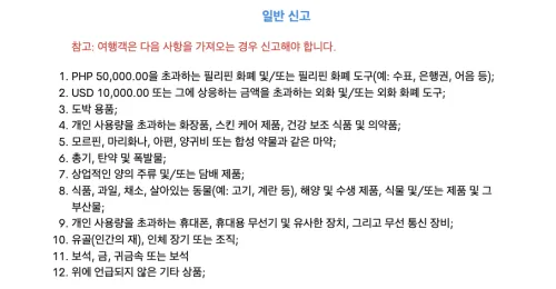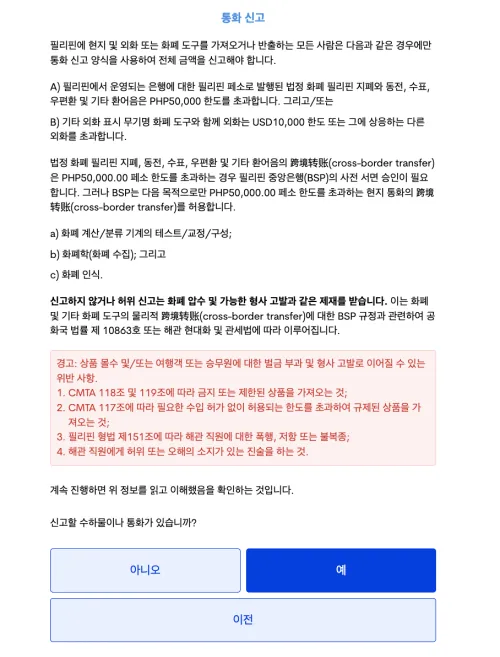 신고 할께 있을 경우 신고 할께 있다고 "예" 를 클릭하고 없으시면 아니오를 클릭 하세요. 아래 필리핀 etravel 화면 참조 |필리핀 이트래블 작성방법
