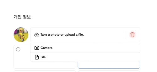 사진은 아래와 같이 추가합니다. 카메라로 찍어도 되고 가지고 있는 여권 사진 파일을 추가해도 됩니다.