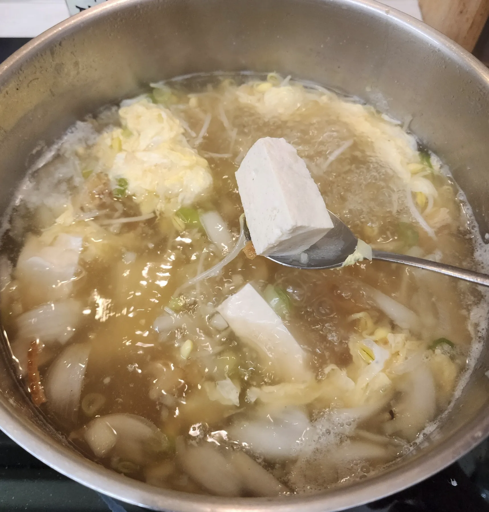 두부와 풀어 놓은 계란을 넣습니다. 물이 많아서 싱거웠습니다. 그래서 소금 및 국간장으로 간을 보고 10분에서 15분 정도 더 끓입니다.