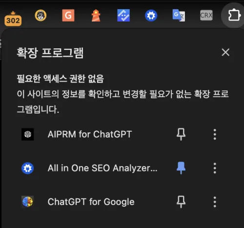 크롬에서 AIPRM 삭제를 위해서는 아래와 같이 크롬 확장 프로그램에서 제거를 하면됩니다. 크롬 확장 프로그램 삭제 방법이라고 보셔도 무관합니다. 크롬 확장 프로그램을 클릭합니다. 크롬 맨 우측 위쪽에 보시면 아래 그림처럼 맨 오른쪽에 퍼즐 모양의 작은 아이콘이 보입니다. 이게 크롬 확장 프로그램입니다. 클릭을 하면 아래와 같이 크롬 확장 프로그램이 새로로 서브 메뉴처럼 펼쳐집니다.  아래로 스크롤 하거나 아니면 저처럼 바로 AIPRM 보입니다. 아래 그림에서도  보이시죠.