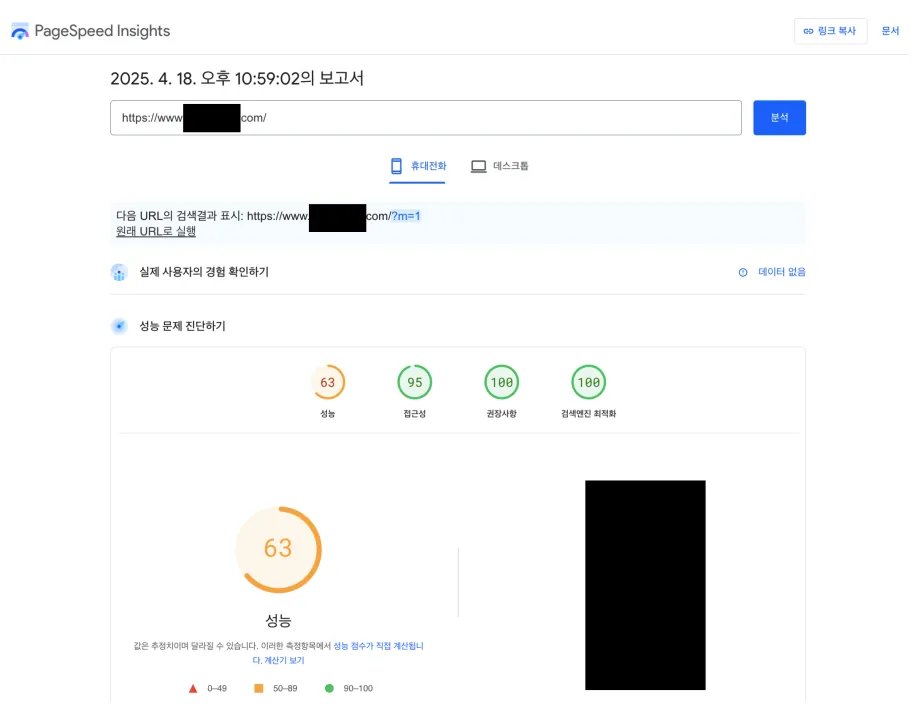 아래 모바일URL이 아닌 리다이렉션 오류가 발생하는 URL ( " https://www.naver.com/blogindex.html " ) 로 점검을 하면 아래와 같이 결과가 나옵니다. 이를 실제 URL 테스트를 하고 색인 요청 하면 색인 등록이 되지 않는 문제를 계속해서 해결 방안을 찾아보고 있습니다. 리다이렉션은 해결이 쉽지 않네요. 잘하면 현재 테마가 원인일수도 있어서 색인이 어그러질까봐 고민되지만 최후의 방법은 티스토리 처럼 반응형 웹 테마를 적용해봐야 할수도 있습니다. ( 테마 변경시 URL 변경이 발생 할수 있는지도 추가로 알아 봐야겠군요. 변경된다면 색인이 다깨지는거라 치명적이거든요 )
