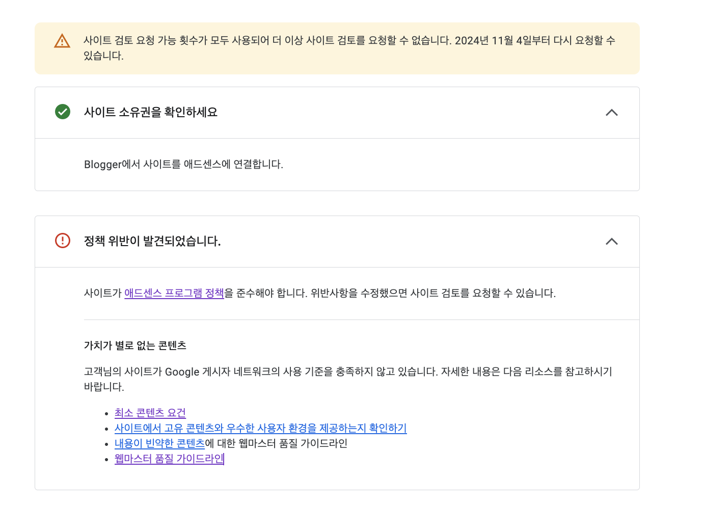 추가적인 정보가 나오면 또 업데이트 하겠습니다. 2024년 10월말에는 애드센스 승인을 희망해봅니다.