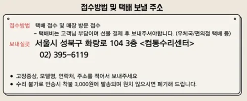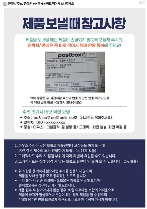 택배 접수 시 주의사항: 꼭 제품별로 각각 쪽지를 작성해서 동봉하세요! 이게 누락되면 접수 처리가 늦어질 수 있습니다.