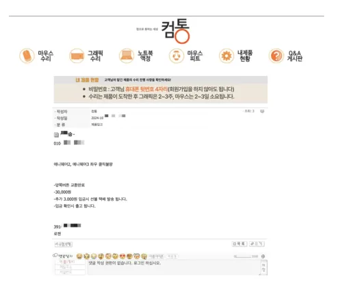 문자에 나온 비밀번호를 입력하면 수리 상태, 입금 계좌정보, 처리 진행 여부를 확인할 수 있고, 입금 후 2~3일 이내에 수리된 마우스가 택배로 도착합니다.