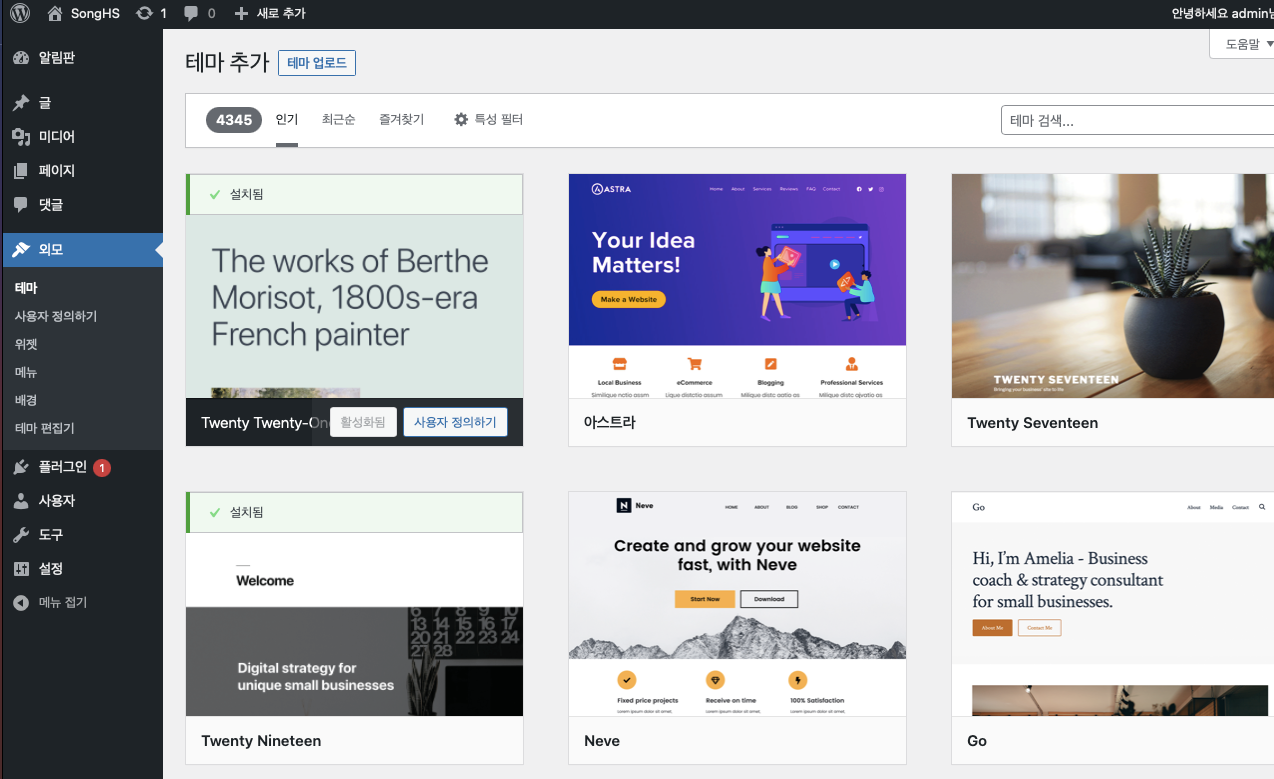 여기서 테마 설치 페이지로 이동합니다. 좌측에 외모 버튼 클릭
