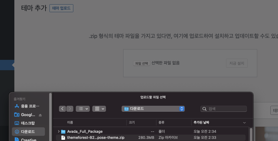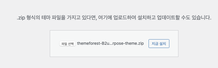 우리가 설치할 Avada 테마 zip 파일을 선택 하고 지금 설치 클릭합니다. 아래와 같이 선택된 zip 파일 파일명이 보입니다.