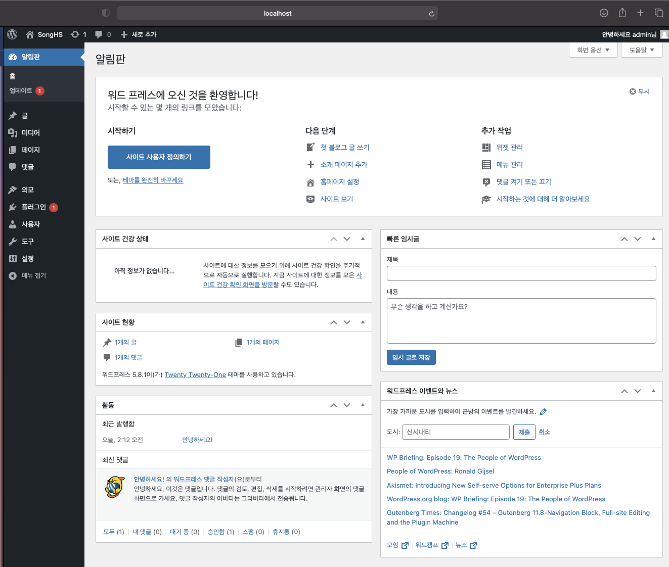 현재 워드프레스 설치된 기본 화면의 모습을 보여 드리겠습니다. 테마 전후 설치의 모습이 어떻게 바뀌는지 차이를 보여 드리기 위해서 입니다.