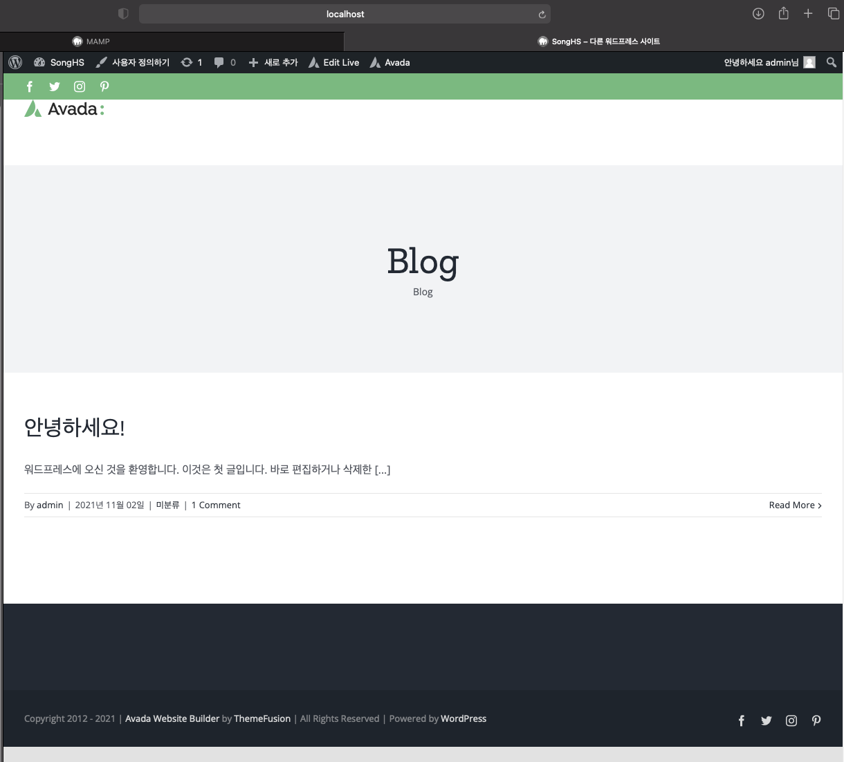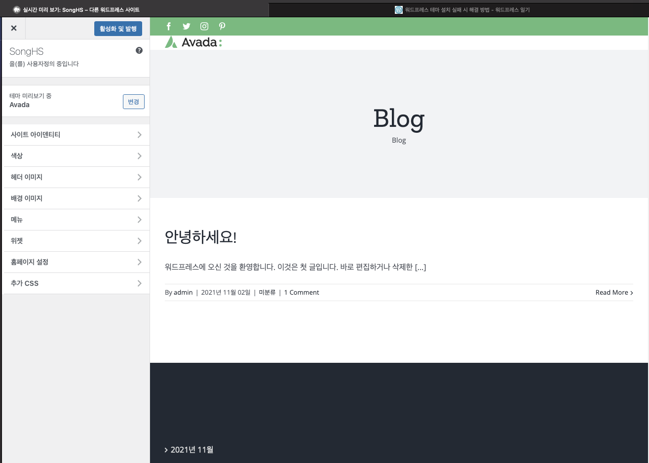 워드 프레스 메인 페이지가 Avada 테마가 적용된걸 보실 수 있습니다.