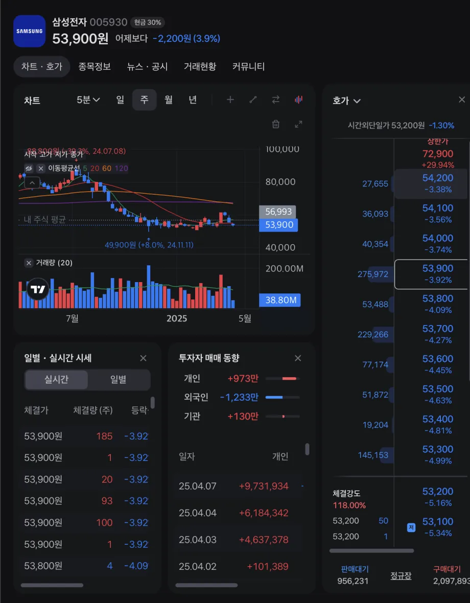 현재 삼성전자의 주가 흐름. 4월 7일자 오늘 아침 4월 8일 장 시작전 트럼프 관세의 효과 주식 시장 폭망의 대표적인 회사지만 그래도 잘 견디는듯. 공매도가 더 큰문제겠지.
