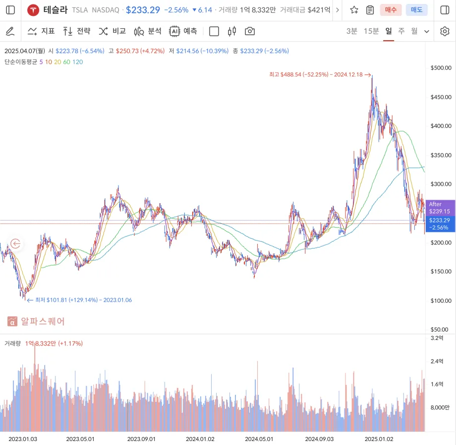 트럼프 관세의 효과 주식 시장 폭망에 일런머스크 마저 구설수에 올라서 온갖 고생을 다하고 있는 테슬라 - 대표이사가 정치에 개입하면 어떻게 되는지 궁금하다. 일런머스크의 미래가 이 하나의 기업으로 판단하긴 그렇지만 궁금해서 지켜보기로함.