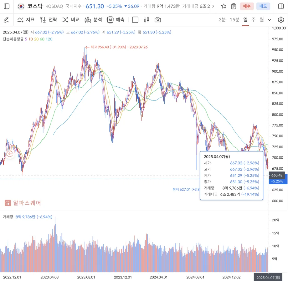 트럼프 관세의 효과 주식 시장 폭망에 따른 나스닥, S&P500 , 코스피, 코스닥의 폭망 상황을 기록에 남겼다 어떻게 시장이 회복할지 궁금하다. 기록을 남기고 작지만 적은 돈을 투자해서 이 시기에 배울껀 잘 배워 볼까 한다. 기업의 실적 악화가 아닌 기업의 미래가 불확실하거나 기업이 망하지 않았고 전체 주식 시장이 폭망하고 흔들리는 시기가 또 왔다. 트럼프 관세의 효과 주식 시장 폭망이다. 이 시기에 조금의 실전 투자로 뼈속 깊이 배울께 하나 있을꺼 같다. 잘배워 보고 뇌에 새겨 놓자. 전체 주식 시장의 폭망과 공포에서 어떻게 투자를 해야 할지. 분명히 배울께 많을꺼 같다.
